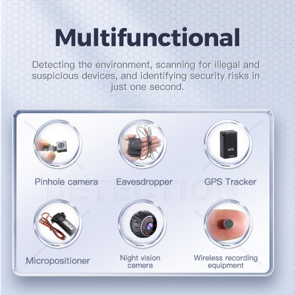 This device can detect hidden cameras (including night vision), GPS trackers, wireless eavesdropping devices, and magnetic positioning tools using advanced RF and infrared scanning technologies.
