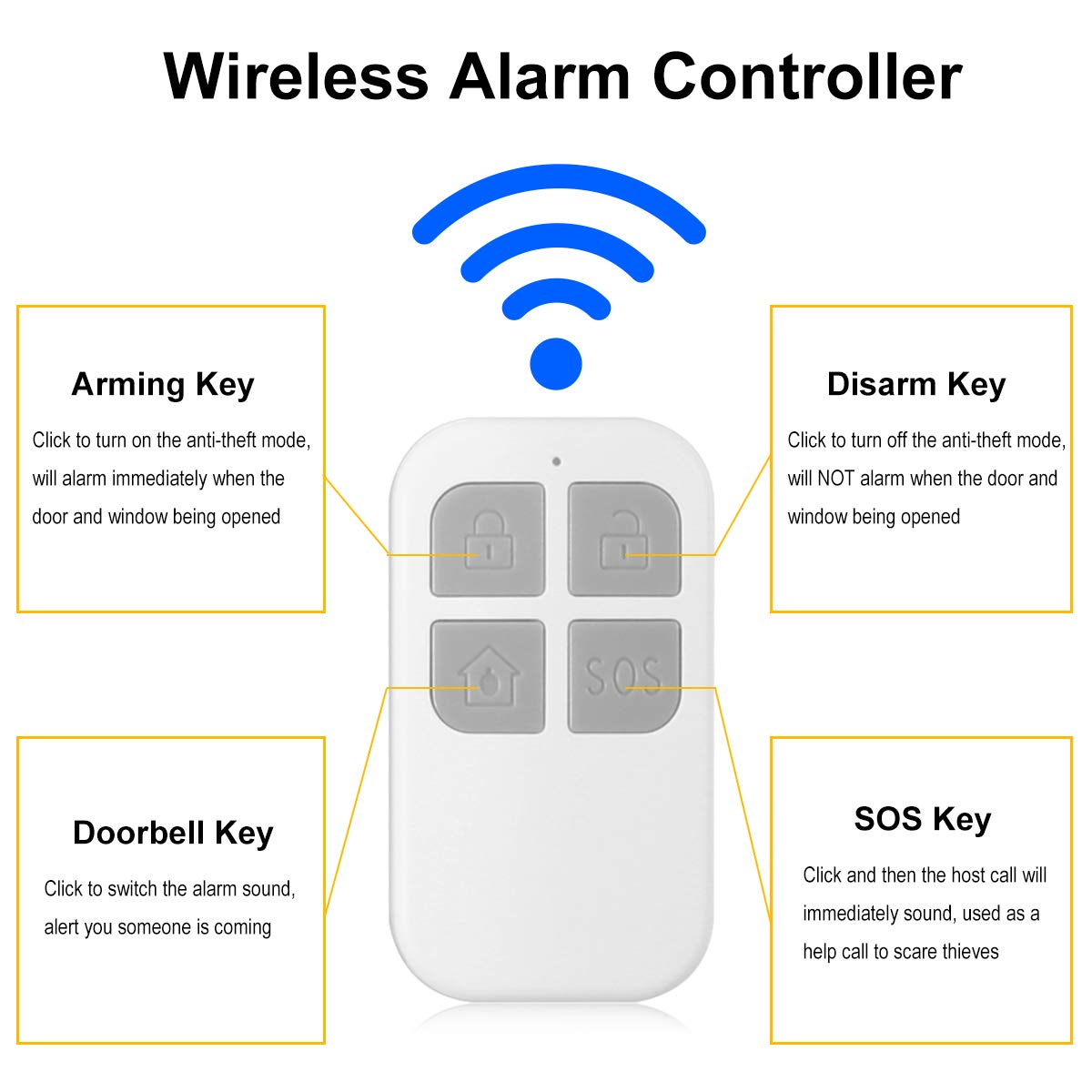 The remote allows users to arm, disarm, and mute the alarm easily, making it convenient for elderly users or non-technical tenants.