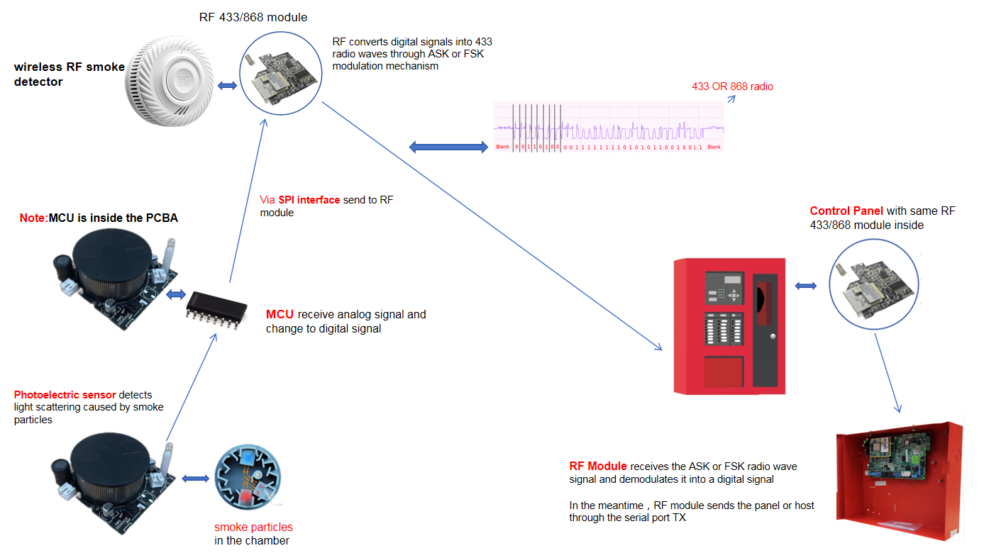 Are you curious about how a wireless RF smoke alarm actually detects smoke and alerts a central panel or monitoring system? In this article, we’ll break down the core components of an RF smoke alarm, focusing on how the MCU (microcontroller) converts analog signals into digital data, applies a threshold-based algorithm, and then the digital signal is converted into 433 or 868 RF signal through FSK adjustment mechanism and sent to the control panel integrating the same RF module.