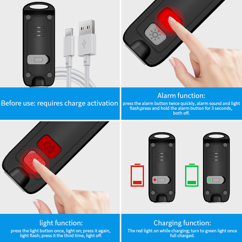 Multi-Function LED Light:With LED high intensity mini flashlights, The personal alarm keychain keep your more safety. It have 2 MODES. The dazzling flash lights MODE can locate your place more quickly especially when it accompanied by siren. The Always Light MODE can bright your way in a dark corridor or at night.