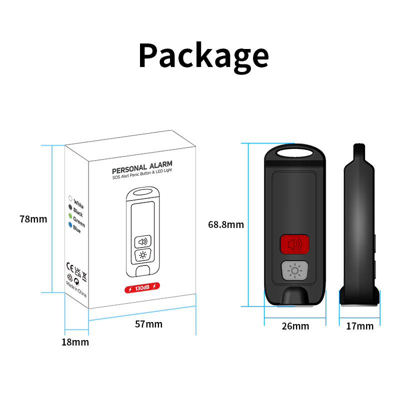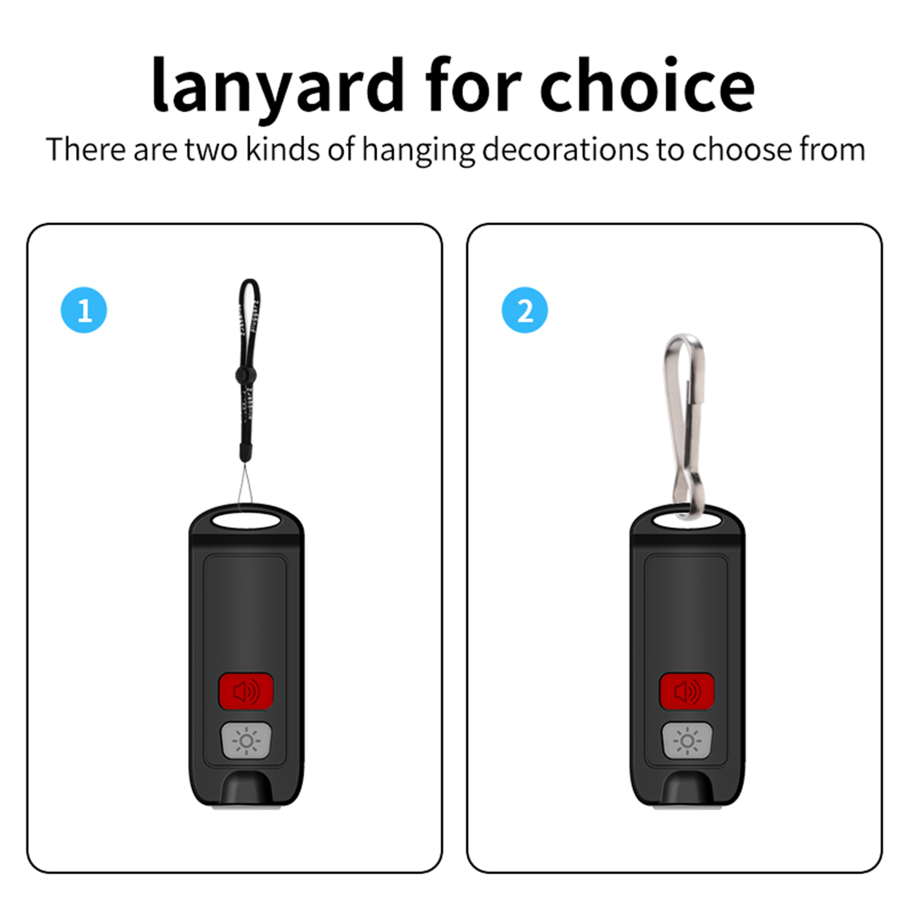 IP66 Waterproof:The Portable Safe Sound alarm keychain made by sturdy ABS material, resistance to fall and IP66 waterproof. It can be used in severe weather such as storms.