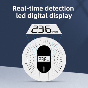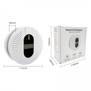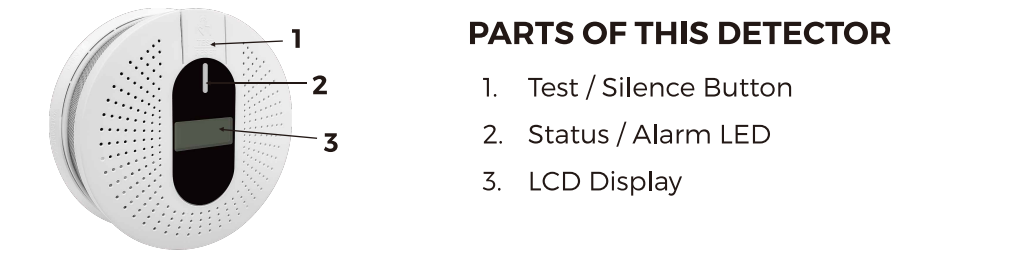 • Press the TEST / SILENCE button to enter the self-test. The LCD display will light up and show the CO and smoke concentration (peak records). The LED on the front will start flashing, and the speaker will emit a continuous alarm.